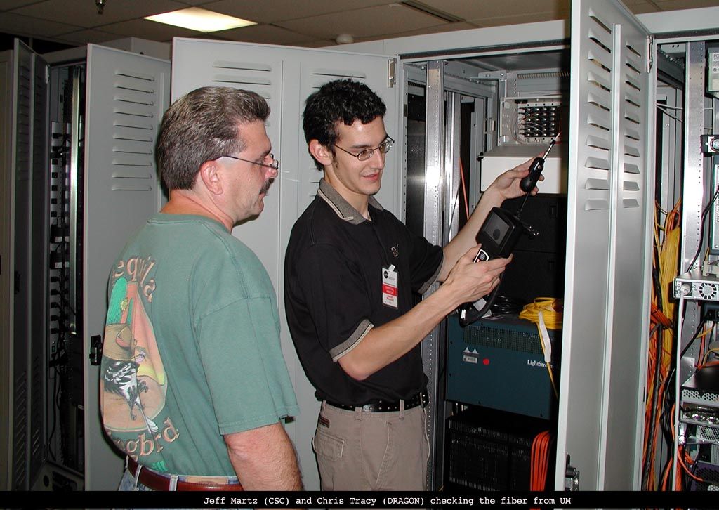 | L-Net and DRAGON reps checking the GSFC end of the optical fiber pair between GSFC and UMCP | L-Net and DRAGON reps checking the Movaz RAYexpress unit prior to its rack mounting at GSFC | L-Net and DRAGON reps readying the rack space at GSFC where the Movaz RAYexpress unit is to be mounted |