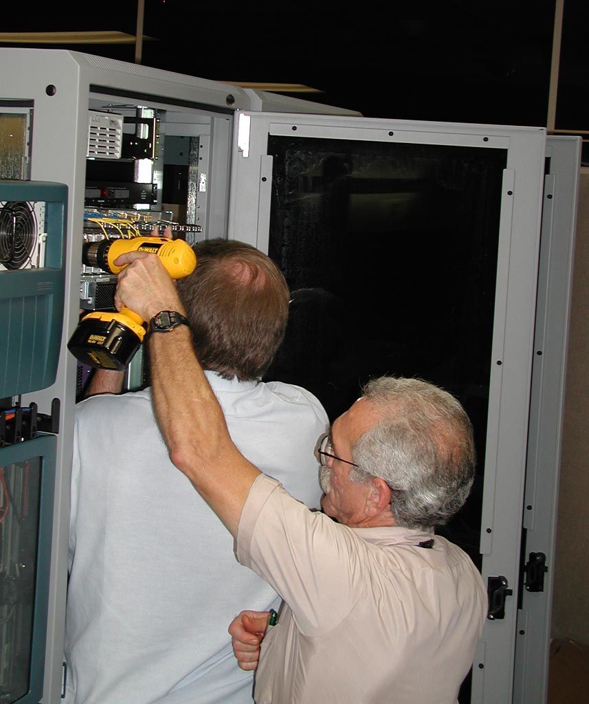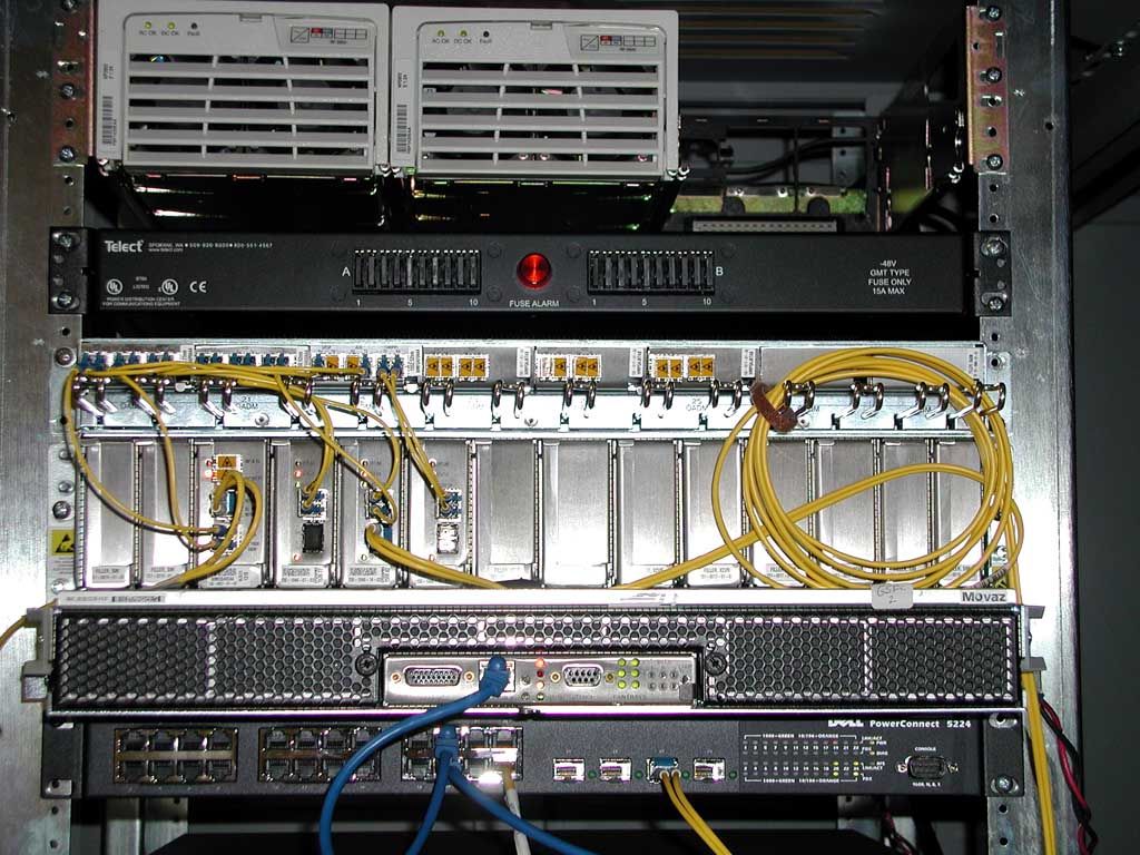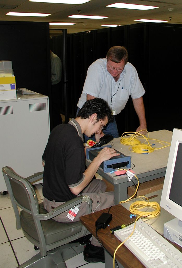 | L-Net and DRAGON reps mounting the Movaz RAYexpress unit in rack at GSFC � 1 of 2 | L-Net and DRAGON reps mounting the Movaz RAYexpress unit in rack at GSFC � 2 of 2 | Movaz RAYexpress unit (rear view) rack mounted and connected with three 2.4 Gbps wavelengths multiplexed onto the optical fiber connecting GSFC and UMCP |