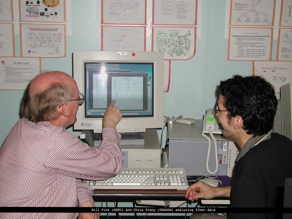 | Movaz RAYexpress unit (front view) rack mounted and connected with three 2.4 Gbps wavelengths multiplexed onto the optical fiber connecting GSFC and UMCP | L-Net and DRAGON reps checking indicators of data flowing across one of the 2.4 Gbps wavelengths between GSFC and UMCP  | L-Net and DRAGON reps following successful installation of the Movaz RAYexpress unit connecting GSFC with UMCP |