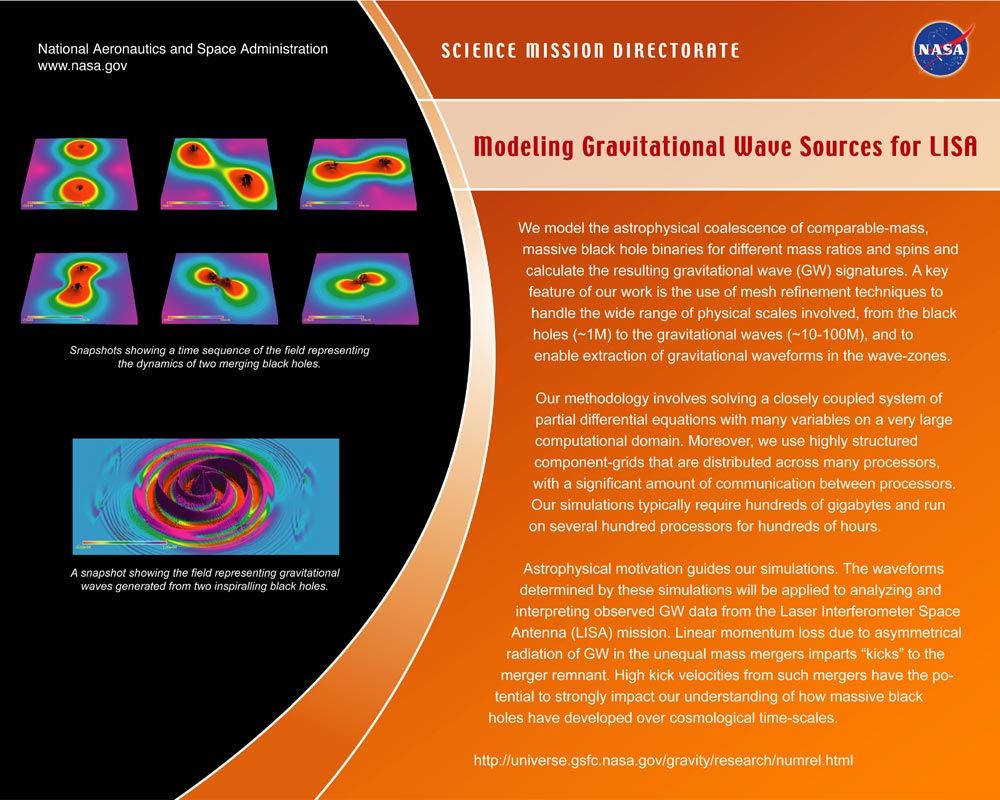 OverviewNumerical relativity is the study of Einstein's equations of general relativity using computer simulations. Groups of scientists around the world, like the group at the Goddard Space Flight Center, are using supercomputer simulations based on Einstein's equations to study how space and time change when very massive objects (like black holes and neutron stars) collide in the universe. The focus of the Goddard group is on applying numerical relativity simulations to model such mergers for gravitational wave and astrophysical applications.Numerical Simulation Techniques